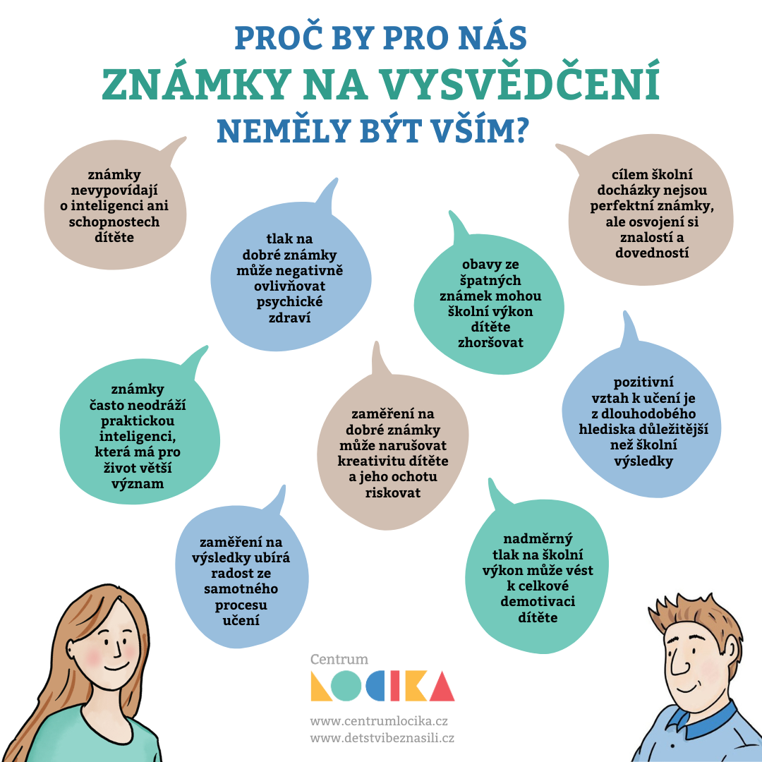 A jaké jsou další důvody, proč nebazírovat na perfektních známkách? I když to tak někdy může působit, dobré známky nejsou a neměly by být cílem školní docházky. Škola by primárně pro děti měla představovat místo, kde mají příležitost získat pozitivní vztah k učení, učit se novým dovednostem a znalostem, a díky tomu naplňovat svůj potenciál. Ve škole si děti současně kromě faktických znalostí osvojují dovednosti jako je spolupráce, hledání kompromisu, respektu ke druhým, tolerance, hledání nových a tvořivých řešení atp. Tyto dovednosti se však bohužel ve škole známkami nehodnotí, přestože mají v životě často větší význam než teoretické znalosti.